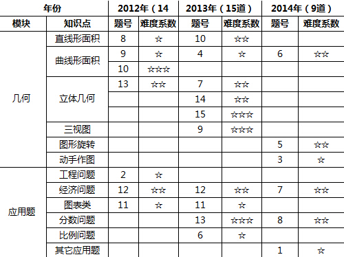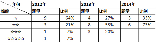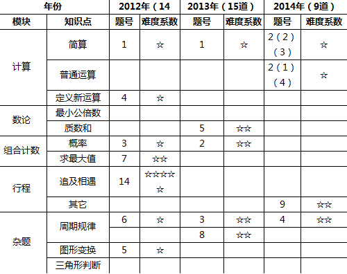 从两个图可以看出,济南外国语试题的整体难度在下降。2013年和2014年都没有难度太大的题,并且难度趋向于两颗星,基本上向数学大本中的拓展题 靠拢。更值得注意的是,2013年和2014年中的部分题直接考察的是课本的基础知识,2014年计算题增多,主要是考察孩子基本的计算和巧算能力。