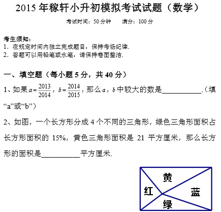 点击下载>>>2015年稼轩小升初模拟考试题(数学)