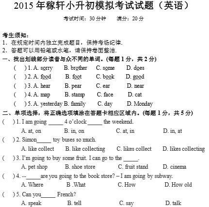 点击下载>>>2015年稼轩小升初模拟考试题(英语)