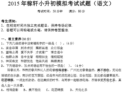 点击下载>>>2015年稼轩小升初模拟考试题(语文)