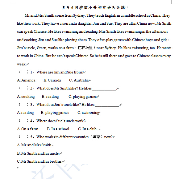 2016济南小升初英语摸底测试第94练(5.6)