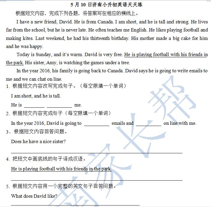 2016济南小升初英语摸底测试第96练(5.10)