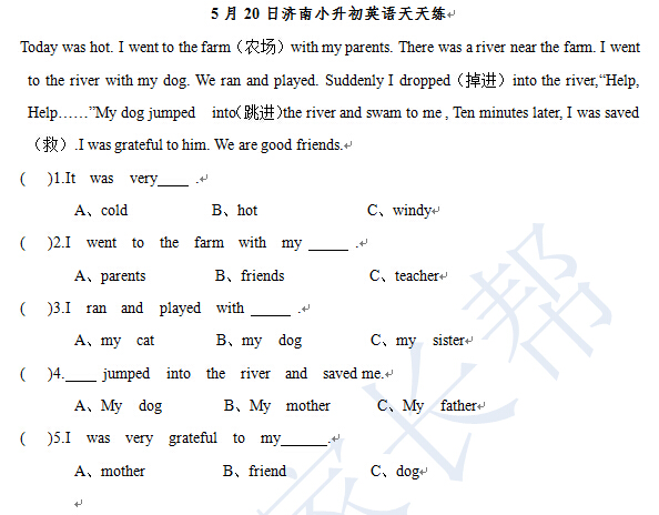 2016济南小升初择校备考开始啦,济南学而思的老师们为了帮助2016济南小升初的孩子们走就自己心仪的学校,每周一至周五更新一练2016小升初英语摸底测试题,并在第二天更新答案,下面就开始5月20日第一百零四天的摸底测试吧。