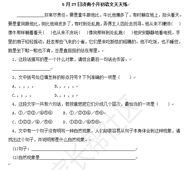 2016济南小升初择校备考开始啦,济南学而思的老师们为了帮助2016济南小升初的孩子们走就自己心仪的学校,每周一至周五更新一练2016小升初语文摸底测试题,并在第二天更新答案,下面就开始5月27日第一百零九天的摸底测试吧。