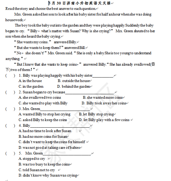 2016济南小升初择校备考开始啦,济南学而思的老师们为了帮助2016济南小升初的孩子们走就自己心仪的学校,每周一至周五更新一练2016小升初英语摸底测试题,并在第二天更新答案,下面就开始5月30日第一百一十天的摸底测试吧。