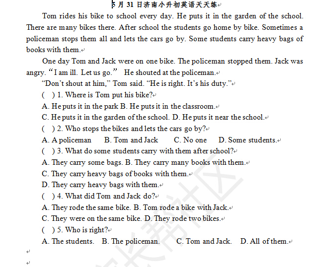 2016济南小升初英语摸底测试第111练(5.31)