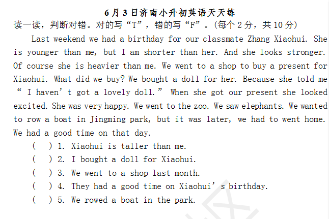2016济南小升初英语摸底测试第114练(6.3)