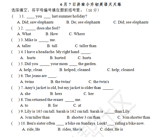 2016济南小升初择校备考开始啦,济南学而思的老师们为了帮助2016济南小升初的孩子们走就自己心仪的学校,每周一至周五更新一练2016小升初英语摸底测试题,并在第二天更新答案,下面就开始6月7日第一百一十五天的摸底测试吧。