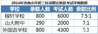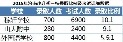 我们整理下2014年和2015年的各校参加考试人数,录取人数,录取比例的数据,竞争激烈程度排名稼轩第一,山大附中第二,济外第三,详细的数据请查看图片: