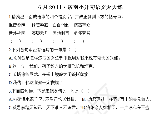 2016济南小升初语文摸底测试第122练(6.20)