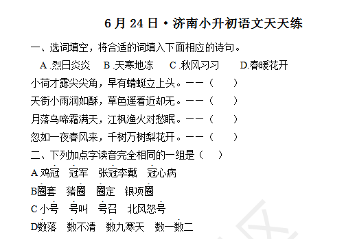 2016济南小升初择校备考开始啦,济南学而思的老师们为了帮助2016济南小升初的孩子们走就自己心仪的学校,每周一至周五更新一练2016小升初语文摸底测试题,并在第二天更新答案,下面就开始6月24日第一百二十五天的摸底测试吧。