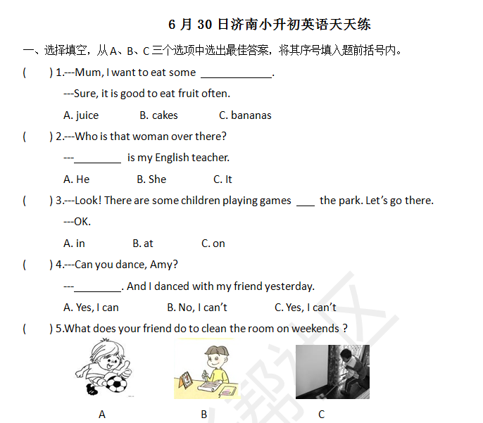 2016济南小升初择校备考开始啦,济南学而思的老师们为了帮助2016济南小升初的孩子们走就自己心仪的学校,每周一至周五更新一练2016小升初英语摸底测试题,并在第二天更新答案,下面就开始6月30日第一百三十天的摸底测试吧。