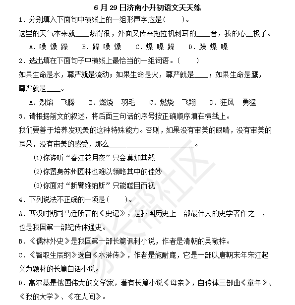 2016济南小升初语文摸底测试第113练(6.29)