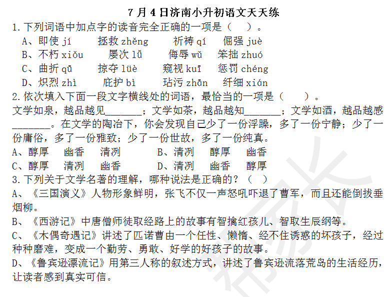 2016济南小升初择校备考开始啦,济南学而思的老师们为了帮助2016济南小升初的孩子们走就自己心仪的学校,每周一至周五更新一练2016小升初语文摸底测试题,并在第二天更新答案,下面就开始7月4日第一百三十一天的摸底测试吧。