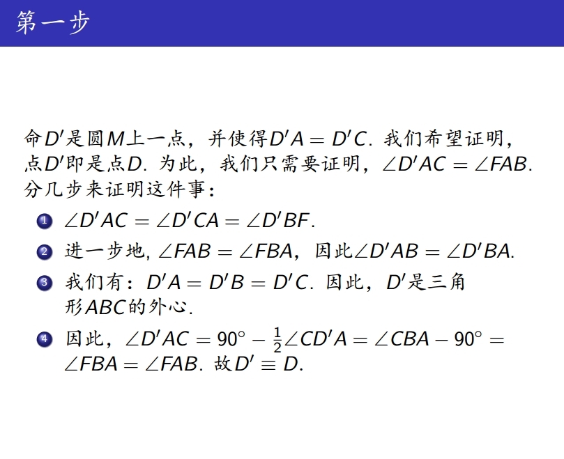 作完外接圆后,我们有下面两个十分自然的步骤,即证明点D和点X的确在圆M上:
