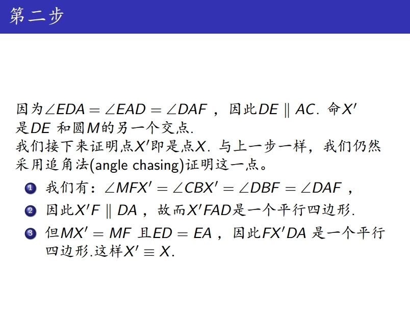 这两个点在圆上的证明都是利用了追角法(anglechasing),这可以说是平面几何的基本证题术,学习了三角形和圆的中小学生应该十分熟悉。对于“chasing”这个词,笔者多说一句:在现代数学里,在各种图上去chasing,是一项基本的技术,例如在同调代数和范畴学里面,我们就需要经常在交换图上去chasing。