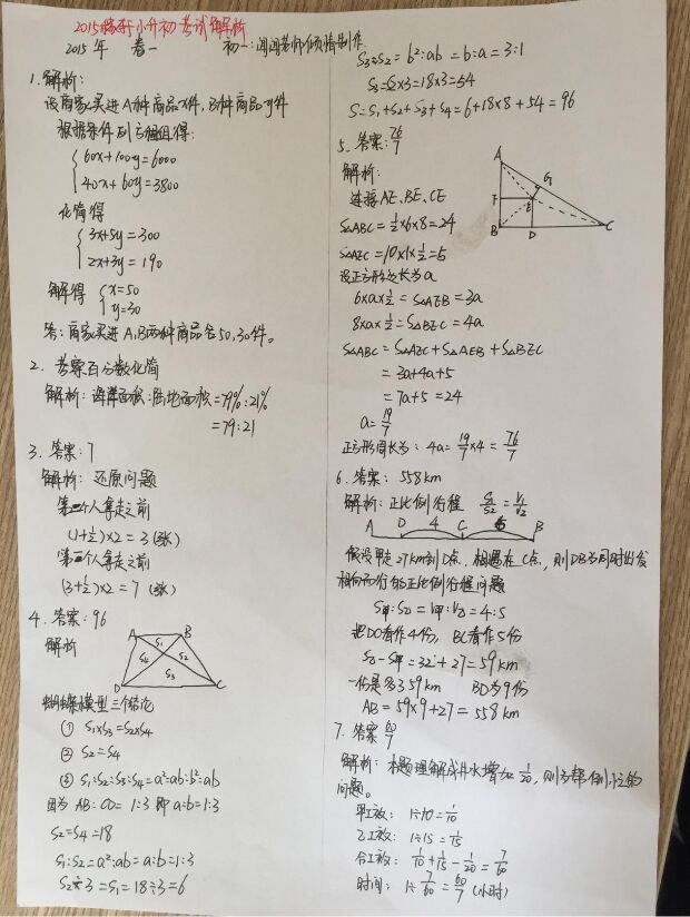 2015年济南稼轩学校小升初考试数学真题解析