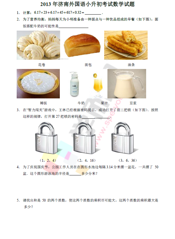 2013年济南外国语小升初考试数学真题