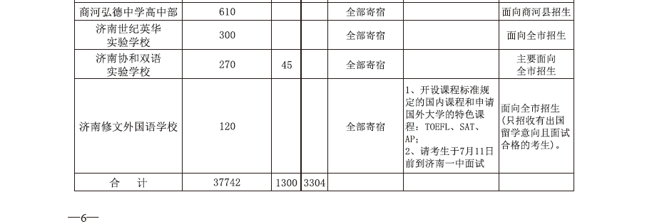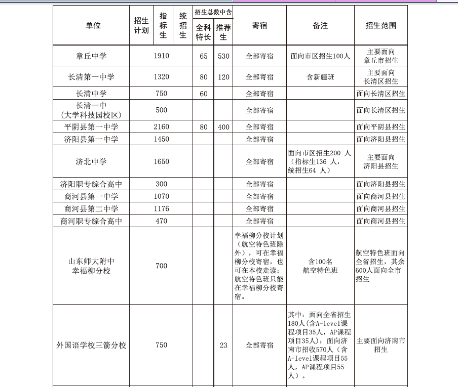 注明:此表大家可以看到省实验、历城二中、山师附中等学校的招生分为都是面向全市招生的,郊区县考生也可以报考的,但经过我们的了解,目前郊区县来每年选择市区的高中孩子并不多,有其一原因是因为比如当地有比较好的高中,比如济阳创新的孩子,在中考前学校会给与一定鼓励政策更希望孩子留在济北高中,还有章丘四中、平阴一中等学校有类似情况。