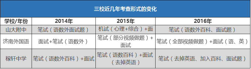 稼轩中学,虽然加入了面试,但是面试不计入总分,并且面试形式越来越简单,借鉴了山大附中的面试方式——面试题在试卷中笔答。稼轩中学的考查内容始终以“语文和数学”为主,近两年取消了英语,2016年,“百科”知识的考查开始算入总分。