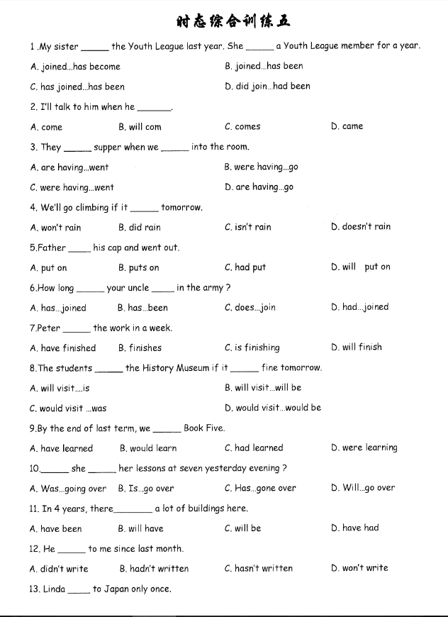济南小升初英语知识点时态综合训练(五) 济南家长帮 2017-06-14 13:35:57 为了方便大家学习英语,更好的进行小升初衔接,下面小编为大家分享一些小升初英语时态语法知识点习题,希望对大家有所帮助!快来一起练习吧! >>点击查看练习题汇总 首页 上一页 下一页 尾页