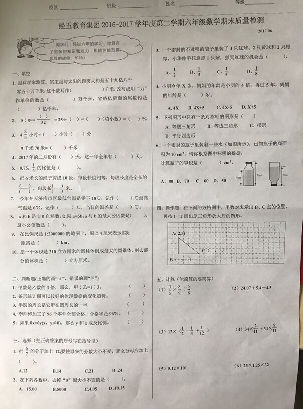 2017年济南经五路小学六年级毕业考数学试卷