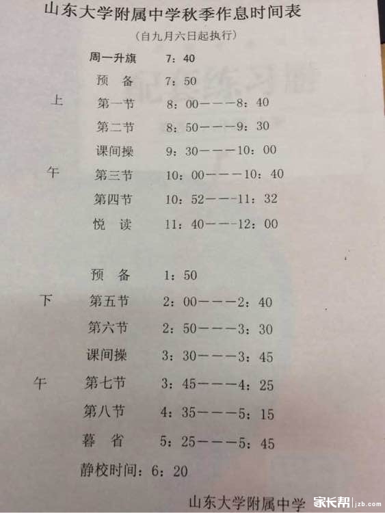 2017年济南山大附中新初一开学安排及学校介绍(4) 济南家长帮 2017-08-21 13:57:30 作息时间表 军训相关事宜还未发布,请大家暂时参考>>2016年济南山大附中新初一军训安排及注意事项 首页 上一页 下一页 尾页