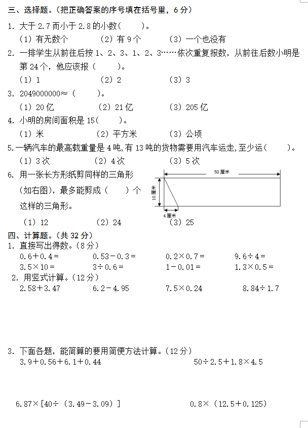 2012年济南小学五年级上学期数学期末考试卷(2)