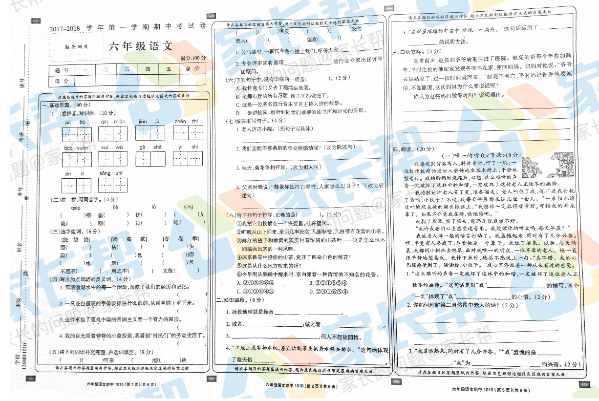 2017-2018上学期济南历城区六年级期中考试语文试卷
