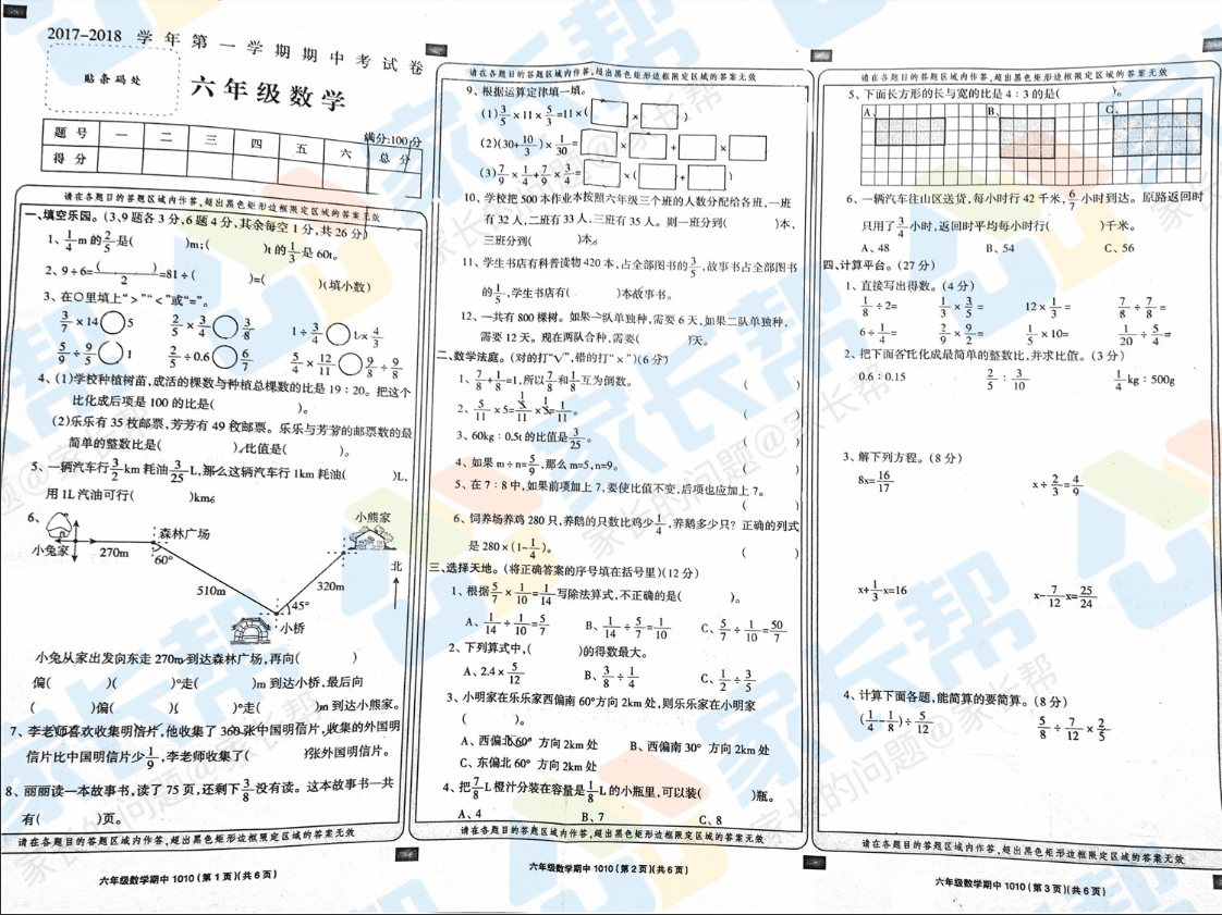 2017-2018上学期济南历城区六年级期中考试数学试卷