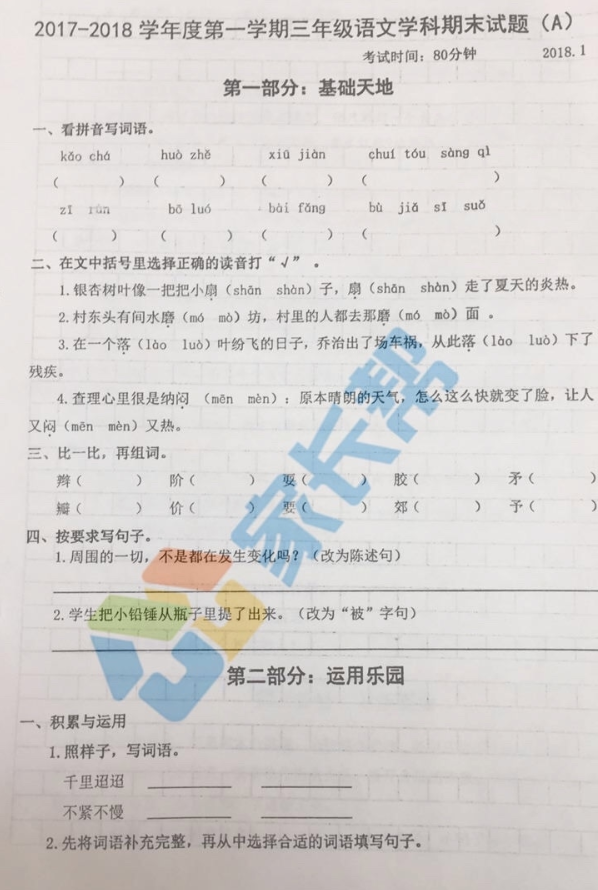 2017-2018济南天桥区三年级语文期末试题