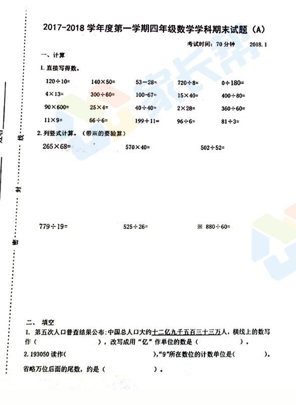 2017-2018济南天桥区四年级数学期末试题