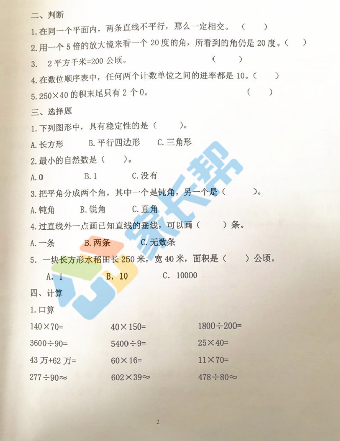2017-2018济南历下区四年级数学期末试题B卷(2)