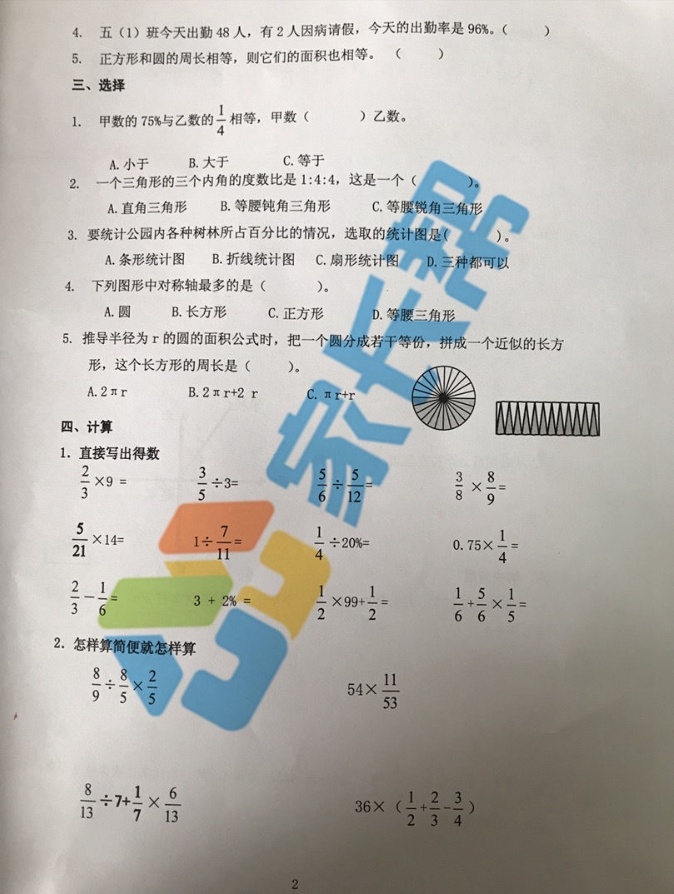 2017-2018济南历下区六年级数学期末试题B卷(2)