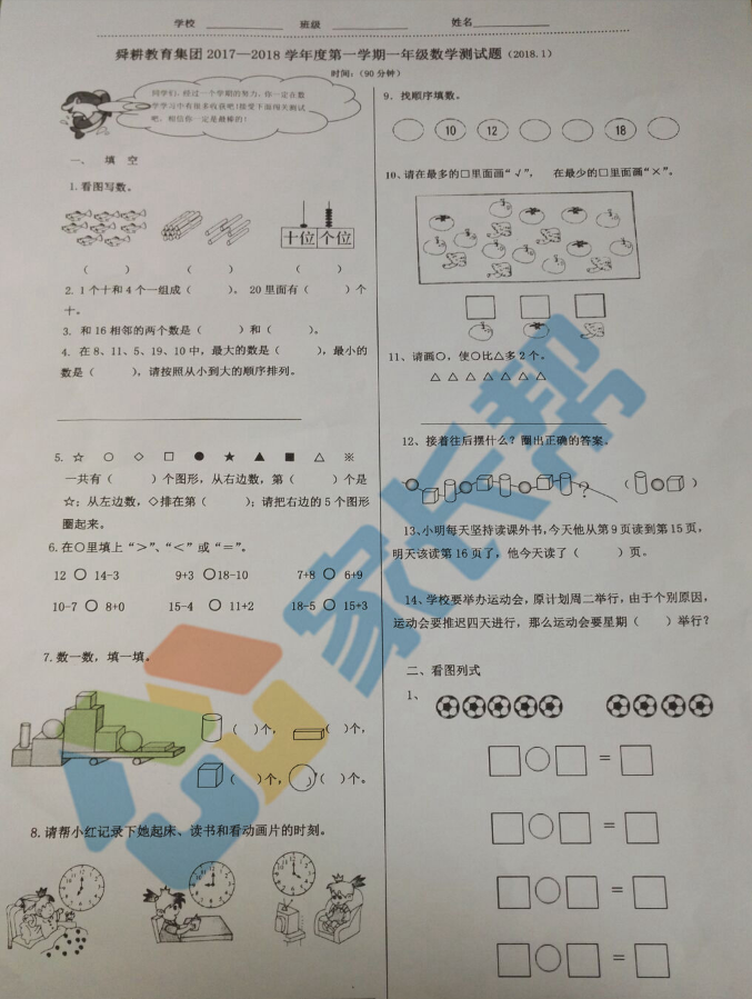 2017-2018济南市中区舜耕教育集团一年级数学期末试题(2)