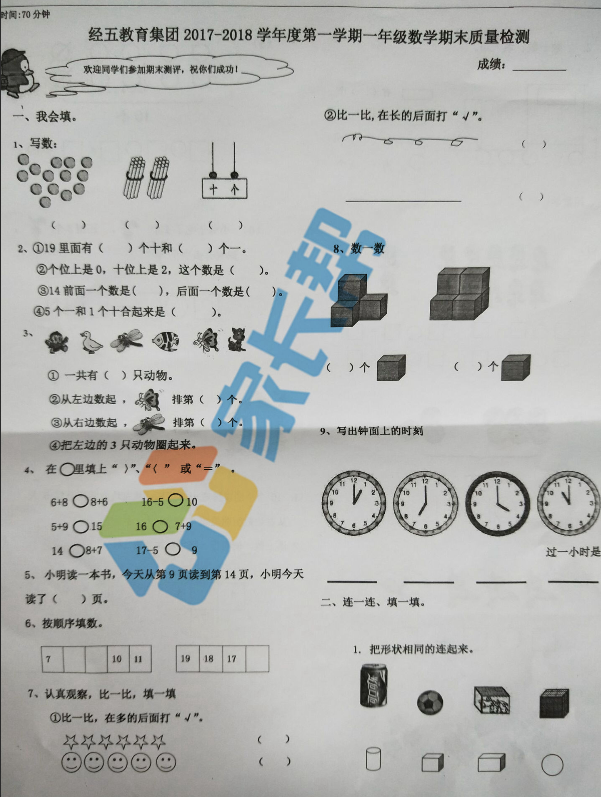 2017-2018济南市中区经五教育集团一年级数学期末试题