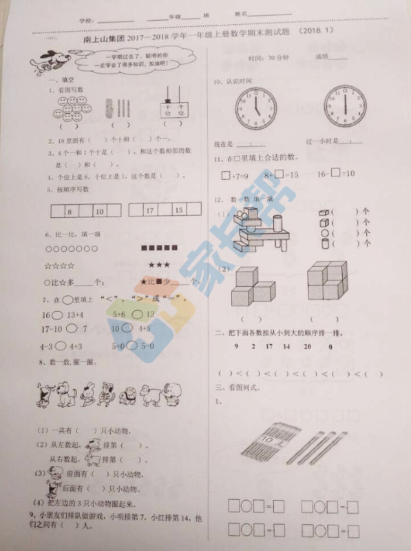 2017-2018济南市中区南上山街小学一年级数学期末试题