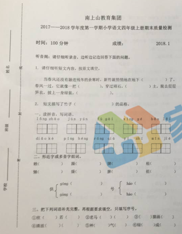 2017-2018济南市中区南上山教育四年级语文期末试题