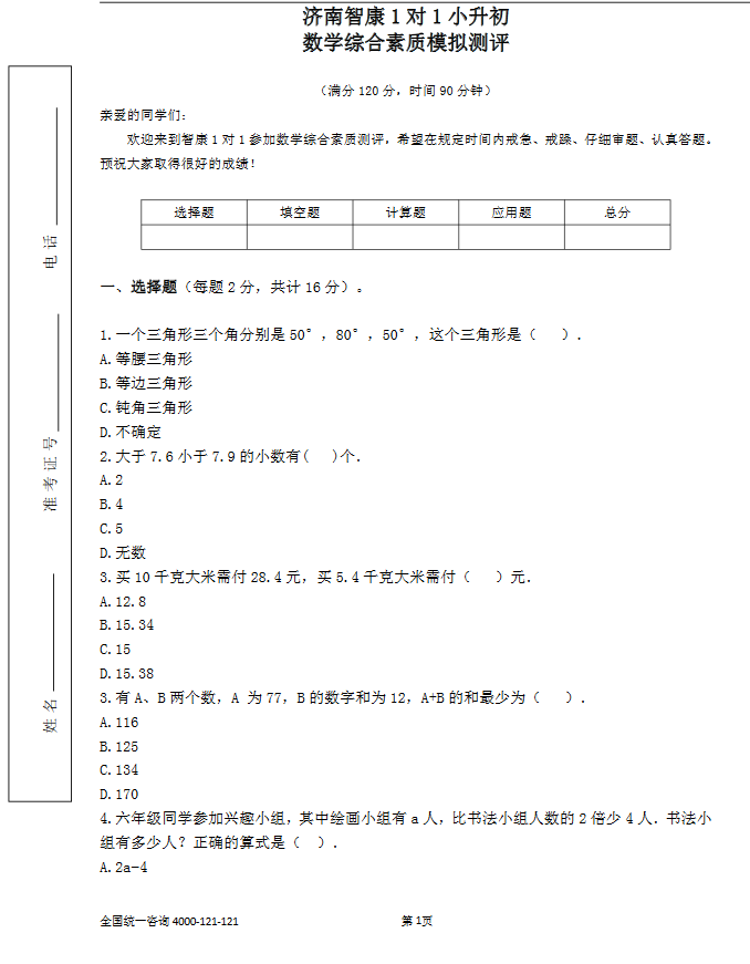 2018济南小升初数学模拟试卷(一)