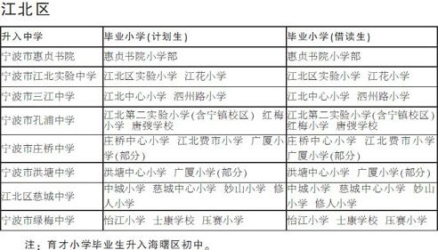 2011年7月3日,宁波海曙、江东、江北三区小学毕业生升初中对口学校方案公布。和去年相比,三区的对口方案略有调整,比如江东外国语实验小学有了第一届毕业生,对口学校为春晓中学;宁波市海曙外国语学校初中部今年在全区招收首届学生。