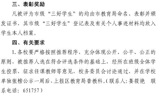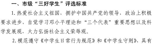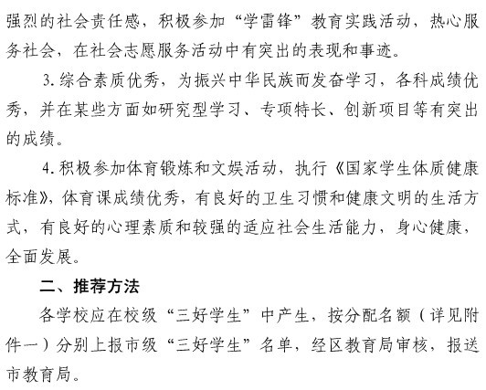 为认真贯彻党的十七届六中全会精神,全面实施《社会主义核心价值系融入中小学教育全过程指导纲要》,进一步加强和改进中小学德育工作,全面推进素质教育,激励广大学生德智体美全面发展,经研究,决定做好2011学年江北区初中市级“三好学生”推荐工作,现将有关事项通知如下: