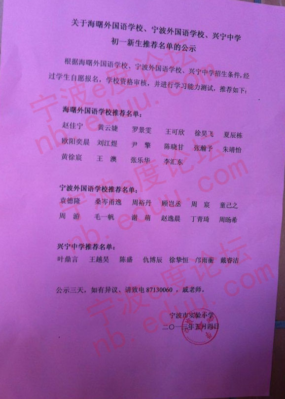 本信息由“nbbaihua”发表于宁波e度论坛,点击查看原帖<<宁波市实验小学宁外兴宁海外推荐名单出炉!