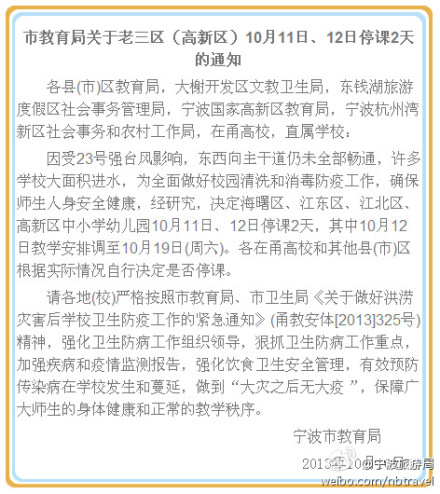 宁波老三区和高新区中小学幼儿园10月11日及12日停课两天