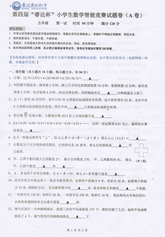 2013年第四届睿达杯数学竞赛五年级一试试卷(A卷)