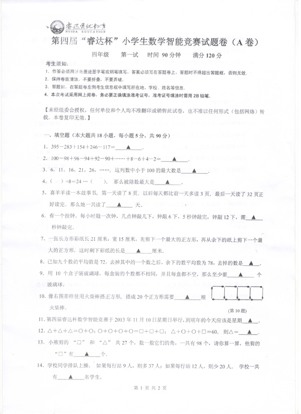 2013年第四届睿达杯数学竞赛四年级一试试卷(A卷)