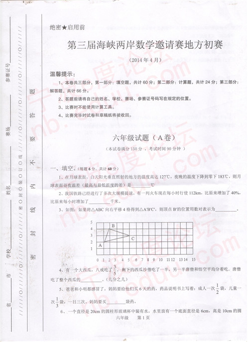 2014年第三届海峡两岸数学邀请赛初赛六年级试题
