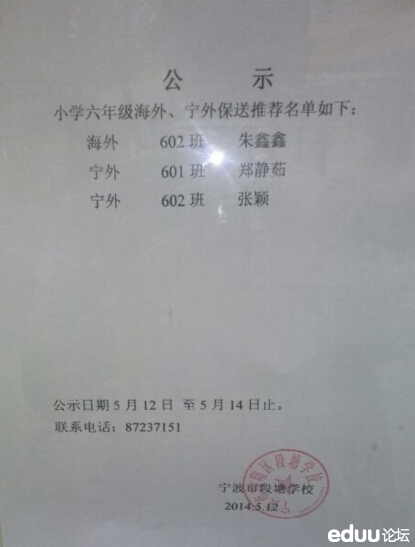 【查看原帖并参与讨论:段塘学校2014年海外、宁外推荐名单公示】