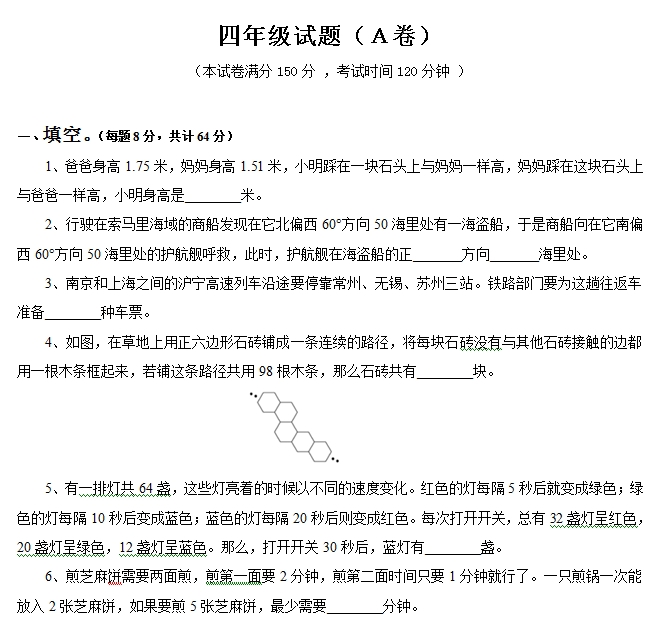 宁波奥数网:2014年第三届海峡两岸数学邀请赛地方初赛于4月20日举行,复赛于5月25日举行,本文发出2014年第三届海峡两岸数学邀请赛地方复赛四年级试题,供广大家长免费下载。