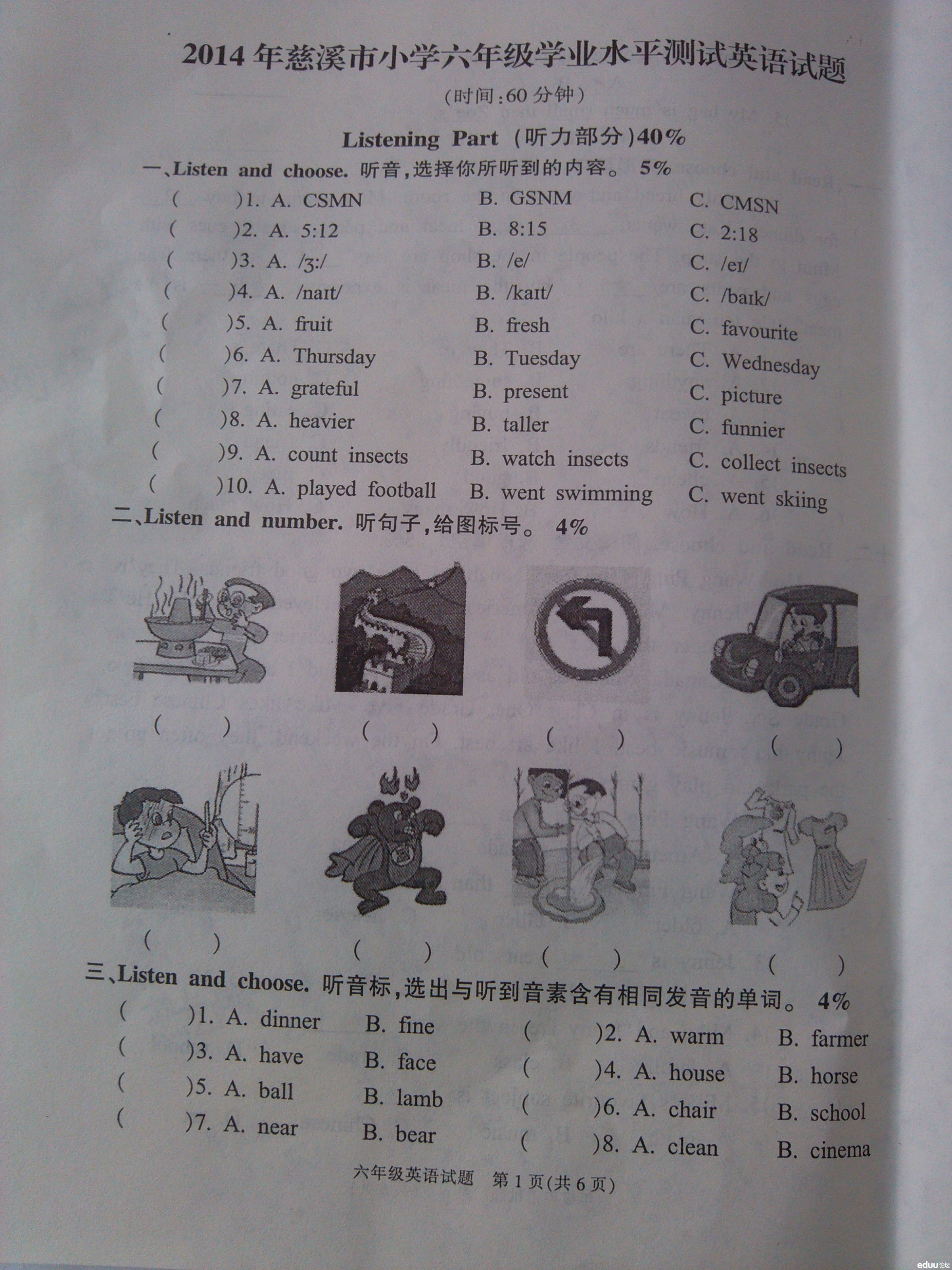 宁波慈溪市发布2014年小学毕业测试英语卷