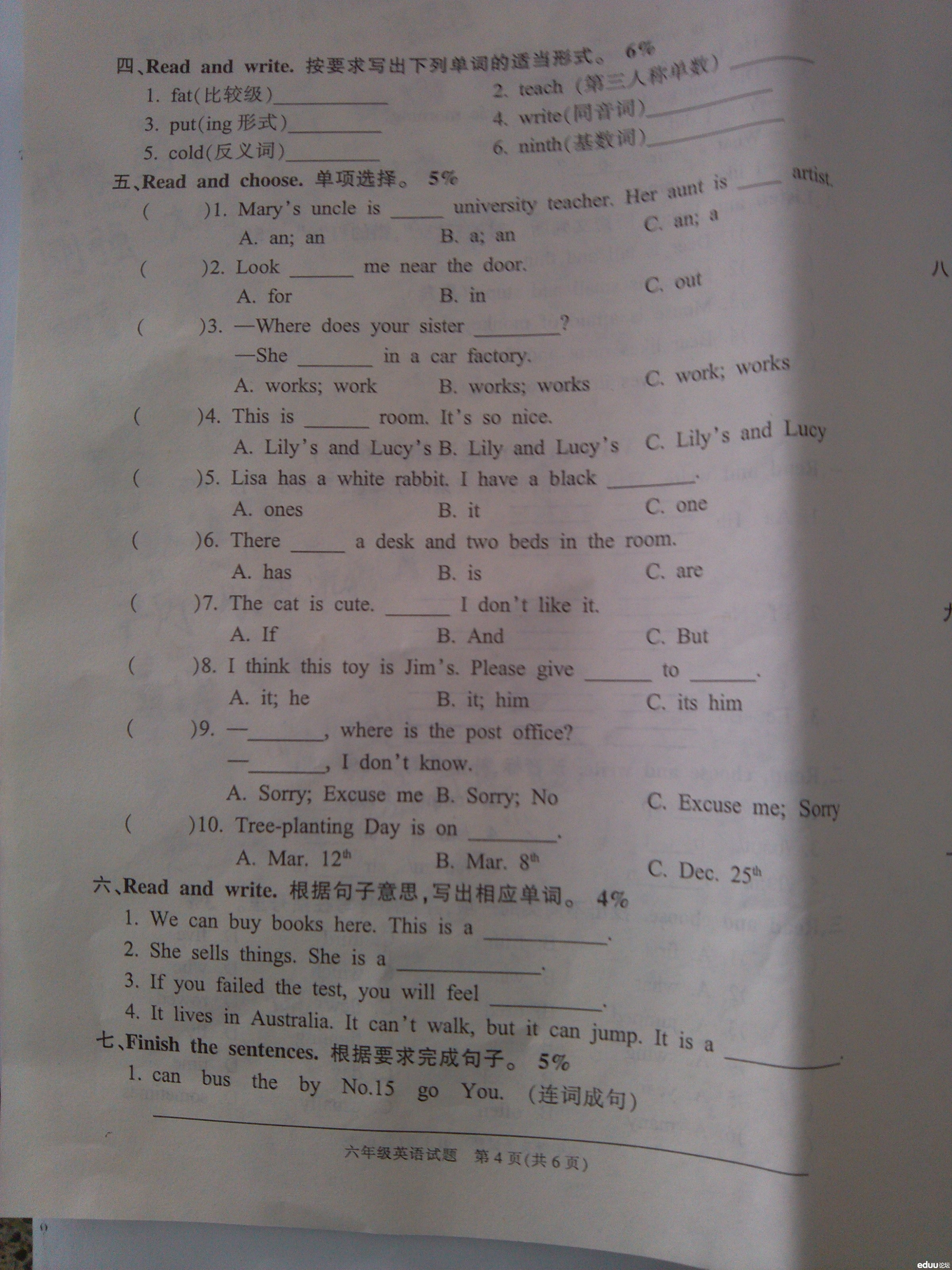 宁波慈溪市发布2014年小学毕业测试英语卷(4)